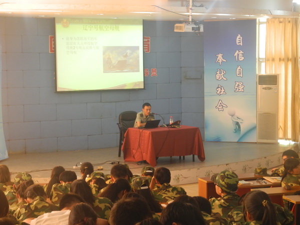 军事教育大会由童宗兴指导员担任主讲,童宗欣指导员给大家讲解了中国人民解放军军衔制度,介绍了有关海陆空三军的制服、礼服和军人所应具有的基本品质。又带领大家认识了当前主要军事强国所拥有的武器装备,使我们更清楚的认识到了我国武器装备的先进性,认识到了我国国防实力的强大,认识到了国家实力的昌盛。