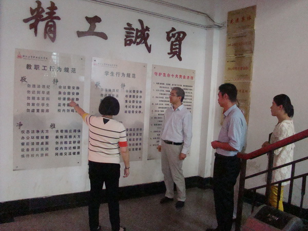 见面会后,贺院长在院领导和相关老师的陪同下,巡视校园并视察我院实训基地建设情况。在看到校门大厅张贴的教职工行为规范,学生行为规范,守卫学生十大黄金法则等宣传标语,贺院长极为肯定,认为这些标语既贯彻总校总体要求,也体现了技师学院特色,是很好的极具工贸特色的校园文化。贺星岳院长先后参观了单片机实训室、PLC实训室、电子商务实训室、速录实训室、数控技术实训室、数控机床装配与维修实训室、电力拖动实训室、电工电子实训室和机床排故实训室等实训场所和设备,并不时了解和询问我院专业建设和各专业的实训开展情况。