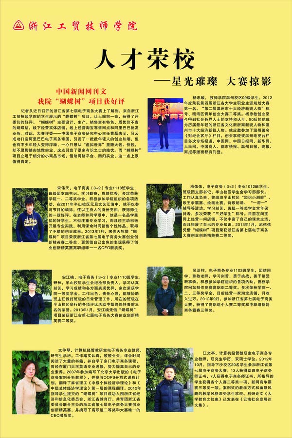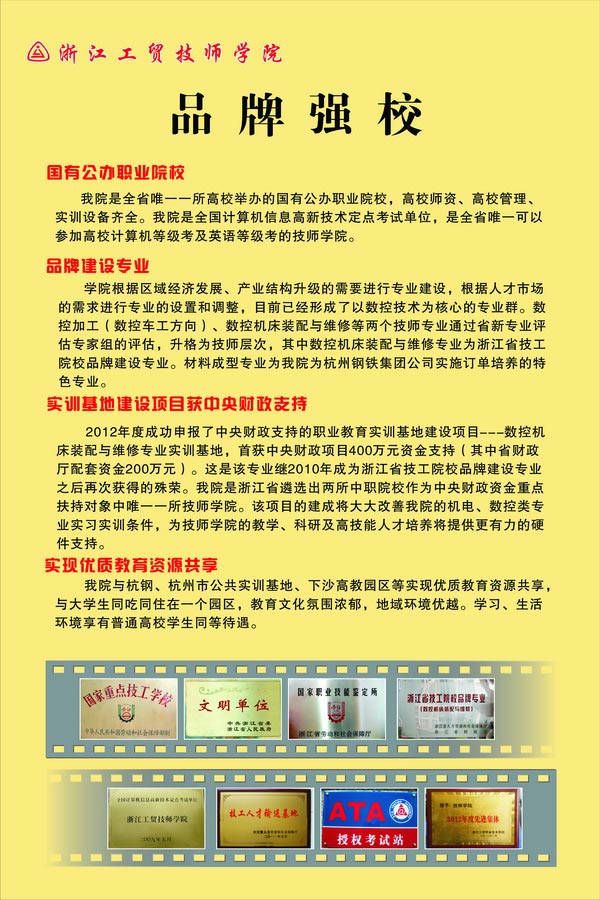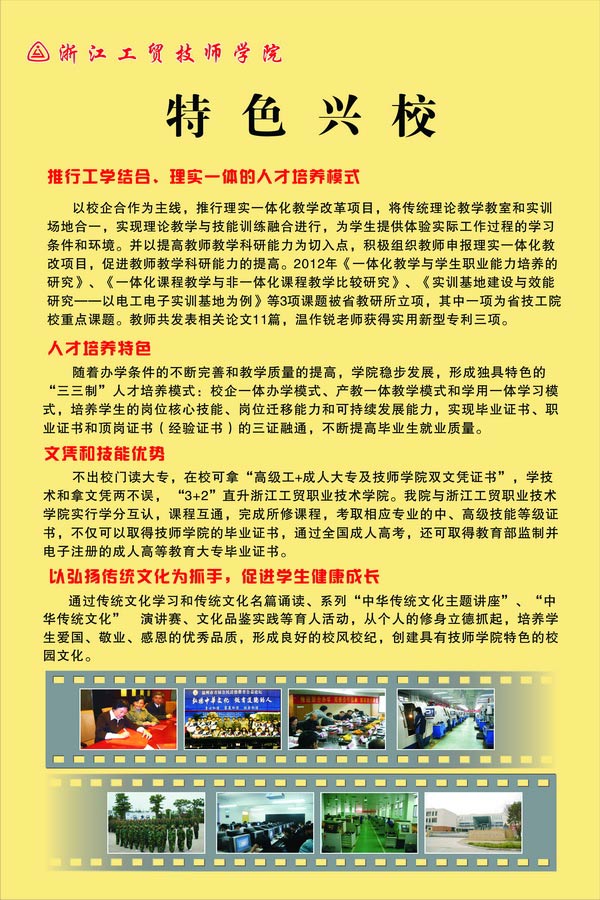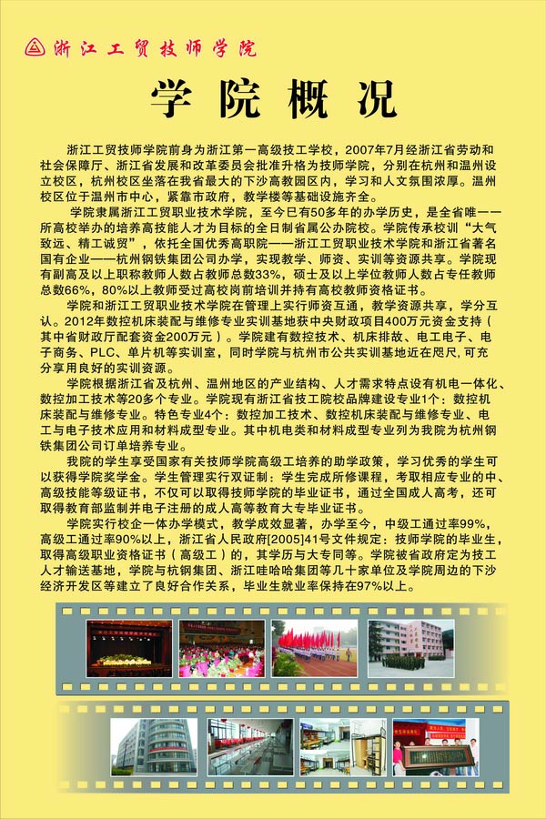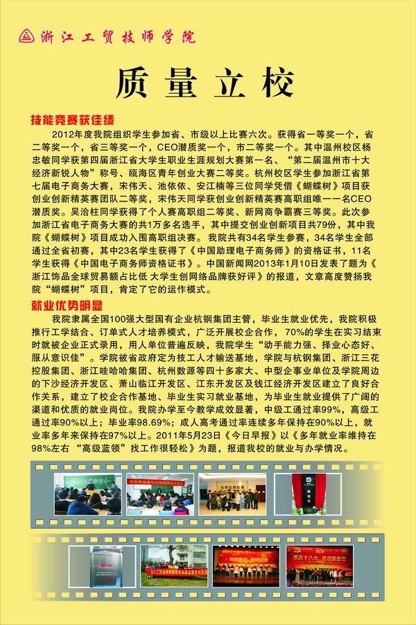 2013宣传窗新鲜出炉,该次宣传窗共分六个专题:1-学院概况;2-特色兴校;3-品牌强校;4-质量立校;5-人才荣校;6-招生简章,较全面简要地介绍了学校基本情况,现将宣传窗内容附录于次,欢迎师生批评指导。(综合办公室)