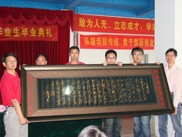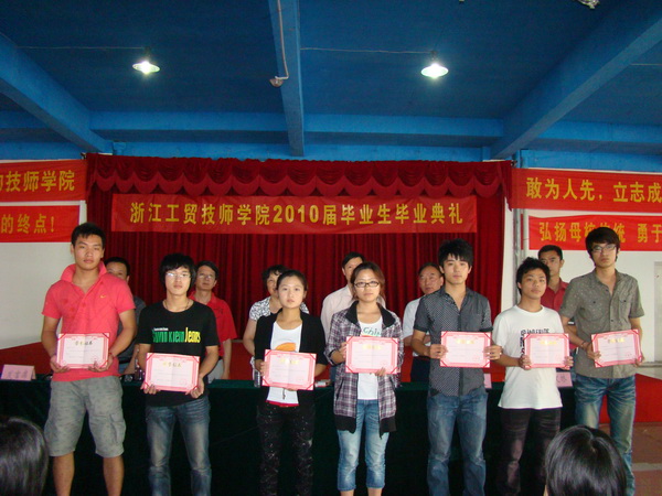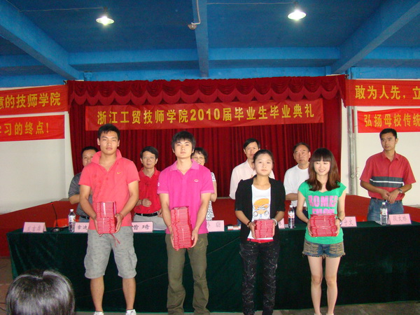 在典礼上,机电0701班和会计与文秘0702班分别向母校赠送了纪念品,借此表达对学院三年培养的感激之情。此外,学院并且对机电0701班顾华明等7位院级优秀毕业生进行了表彰,最后为全体毕业生颁发了毕业证书。