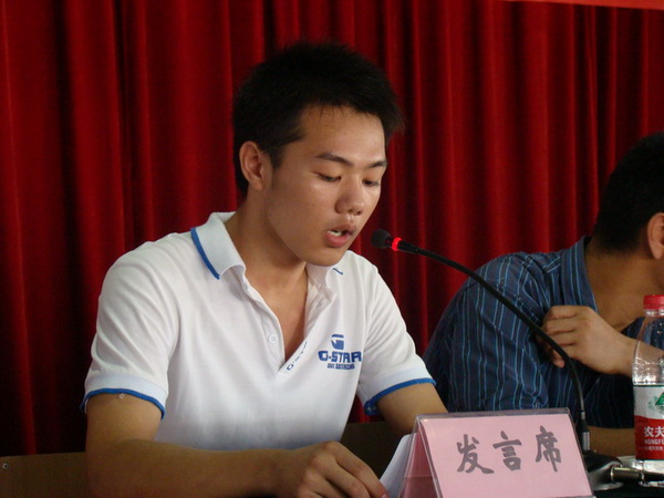 接着老生代表赖国强同学和新生代表张美亮同学分别上台发言,倡议新生要尽快适应新的大学生活,树立远大的奋斗目标,共同营造团结友爱的氛围,尊师肯学,持之以恒,努力提高自己的实践能力,严于律己,树立规范意识。