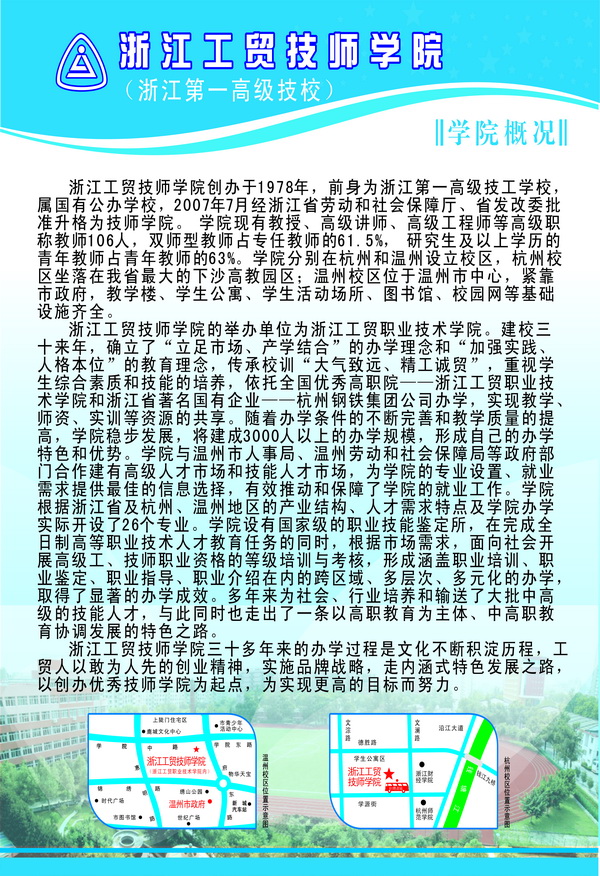 5月7日,我院新的宣传栏正式亮相,成为向全院师生及外来宾客展示我院基本概况、办学特色,体现我院风貌的首个名片。新宣传栏主要分学院概况、专业简介、专业带头人、招生简章、就业指导、校园文化剪影等六个板块。现在我院师生、周边高校师生及其他来宾都会驻足在宣传栏前关注我院的最新动态,提高了院内师生对学院情况的认知度,也增强了院外来宾对我院的了解。