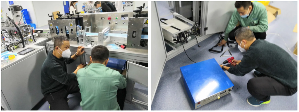 进入车间后,三位老师和车间技术员曾杨勇迅速对接,了解了生产线故障情况,立马对机器展开“望闻问切”。温老师说:“我们以前没接触过口罩生产设备,时间又紧,因此压力很大。”凭着扎实的专业知识和过硬的技术本领,在经过现场勘查和技术分析探讨后,他们判定出问题所在:1号全自动口罩生产线故障范围为口罩无纺布进料机构超声波焊接机故障;2号全自动口罩生产线的口罩裁剪包边超声波焊接件功率不稳定,产生了过载故障。