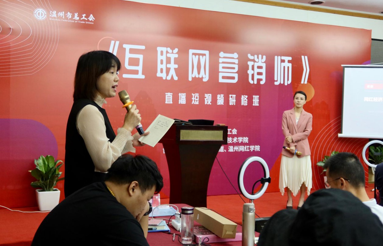 为加快新型数字化创新创业人才培养,提高我市产业工人队伍整体素质,助推职工创新创业和转岗再就业,9月19日上午,由温州市总工会主办,学院技师与继续教育学院承办的温州市职工网络主播培训班在蒲鞋市街道文创会客厅举行了开班仪式。温州市总工会权益保障部副部长方克鹏、技师与继续教育学院院长黄路瓯、温州市腾悦网络科技有限公司董事长王玲慧,以及来自我市20多家企业的50名学员参加了开班仪式。