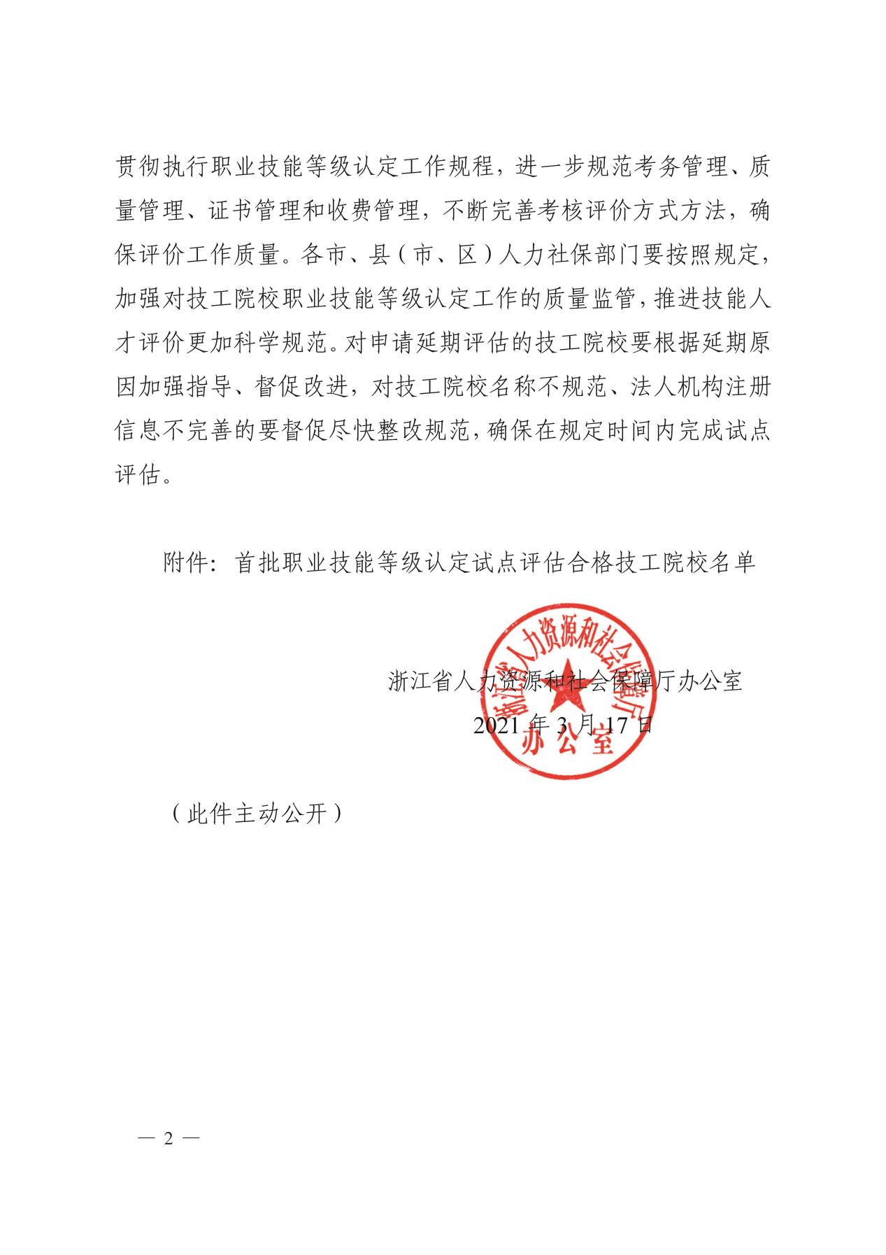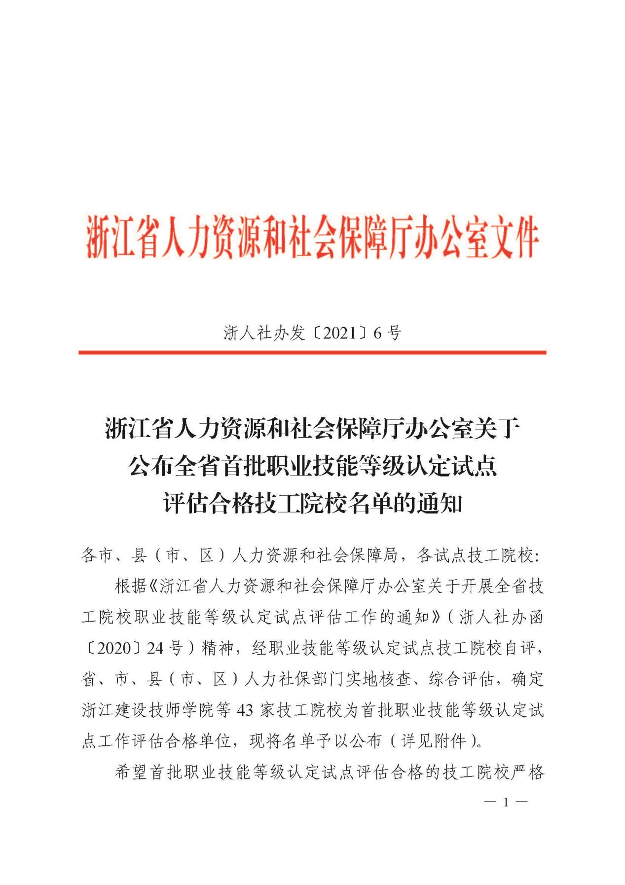 2021年1月26日省职业技能鉴定中心派遣专家组来我院对职业技能等级认定试点工作进行了综合性评审,在评审过程中专家组对我院试点期间的工作一致予以肯定,并于2021年3月17日下达了《浙江省人力资源和社会保障厅办公室关于公布全省首批职业技能等级认定试点评估合格技工院校名单的通知》(浙人社办发〔2021〕6号),至此,我院正式成为浙江省(省本级)首批职业技能等级认定试点工作评估合格单位。