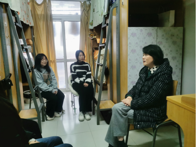 黄路瓯院长走访了女生寝室,她对学生表达了关心问候,亲切询问同学们在校生活、学习方面遇到的问题和困难,并向同学们宣讲了党的二十大精神,叮嘱大家要感党恩、听党话,坚定理想信念,学好专业知识,做好人生规划,积极参与校园活动,提升自身能力与价值,为将来投身中国式现代化建设打下扎实的基础。