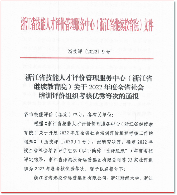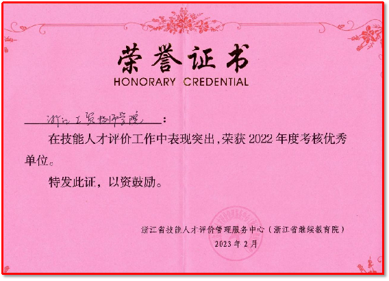 2023年2月28日,浙江省技能人才评价管理服务中心2022年度工作总结会议在杭州隆重召开,我校被评为33家浙江省社会评价组织考核优秀单位之一,并在大会上接受表彰。