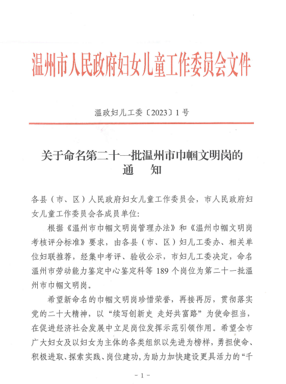 近日,温州市人民政府妇女儿童工作委员会公布了第二十一批温州市“巾帼文明岗”名单,我院培训中心获第二十一批温州市“巾帼文明岗”荣誉称号。