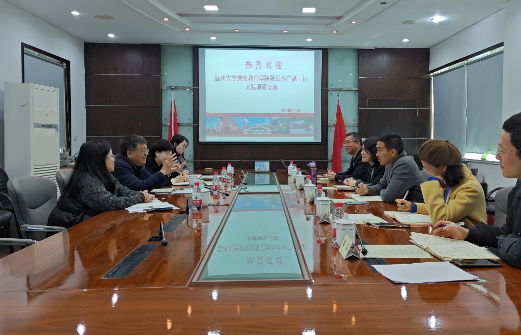 3月7日上午,温州大学继续教育学院院长孙广福、副院长林鹣鹣等一行四人来我院开展调研交流。我院院长黄路瓯、副书记俞通海、副院长杨鹏等相关人员陪同调研座谈。