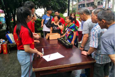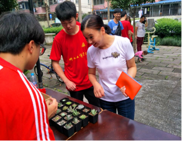 学生们才刚刚布置完活动场地,菱藕社区的居民都纷纷排好队伍,一个老人在将自己的物品放在桌上的时候还笑嘻嘻的说“看到你们活动的宣传,我昨天就准备好了,就等你们开始了”菱藕社区居民们肯定的笑脸,似乎将夏天的炎热都驱散了,队员们一个个鼓足干劲,有的老人拿不动东西,学生们决定分为两组,一组继续留在活动场地,一组则是帮助老人拿物品。“以久换绿”的活动整整持续了一天,在最后一名居民笑着向我们走后,学生们都累坏了,那是却还是笑着讨论今天的活动。