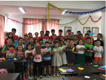 在一个个孩子来到活动场地时,学生们马上就开始忙碌了起来,由一个学生先在讲台上开始讲解有关环境污染的问题,随后开始了今天的环保折纸活动,先讲解、示范一遍折纸过程,然后其余学生在下面帮助孩子们自己动手折,给予他们耐心的讲解和帮助。在最后所有的孩子都完成了今天的折纸作品,听着孩子们一句句“谢谢哥哥姐姐”,学生们都非常满足今天的活动。